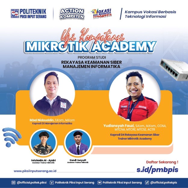 Serang, 10 Mei 2025 – Program Studi (Prodi) Manajemen Informatika dan Rekayasa Keamanan Siber Politeknik Piksi Input Serang kembali menorehkan prestasi melalui Kegiatan Peningkatan Kompetensi Program Studi (PKPRODI) Mikrotik Academy. Kegiatan yang telah berlangsung sejak 24 Juni 2020 ini kini memasuki gelaran ke-18 pada tahun 2025. Selain itu, capaian tahun ini terus menunjukkan peningkatan yang […]
